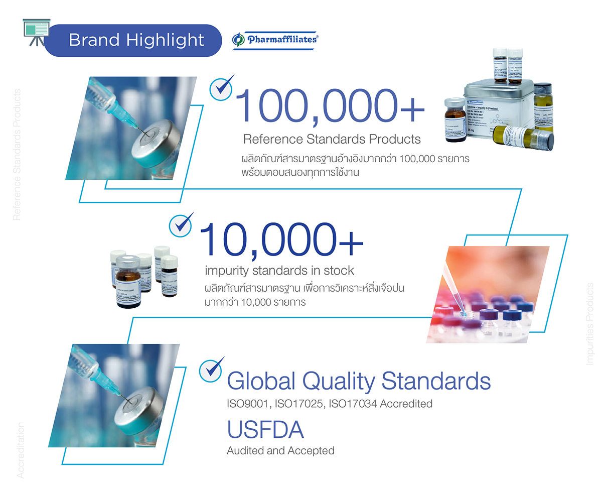 ภายใต้การนำของ Dr. A.K Sabharwal ผู้อำนวยการผู้ก่อตั้งของ Pharmaffiliates ซึ่งมีประสบการณ์ยาวนานกว่า 35 ปี ในด้านการวิจัยด้านเภสัชกรรม การประกันคุณภาพ ซึ่งทีมงาน Pharmaffiliates ได้รับมาตรฐานสากลมากมาย ซึ่งการรับรองดังกล่าวได้บ่งชี้ถึงคุณภาพและความน่าเชื่อถือสำหรับกระบวนการการผลิตสินค้าในกลุ่ม Reference Material โดยมาตรฐานการรับรองที่ Pharaffiliates ได้รับมีดังนี้