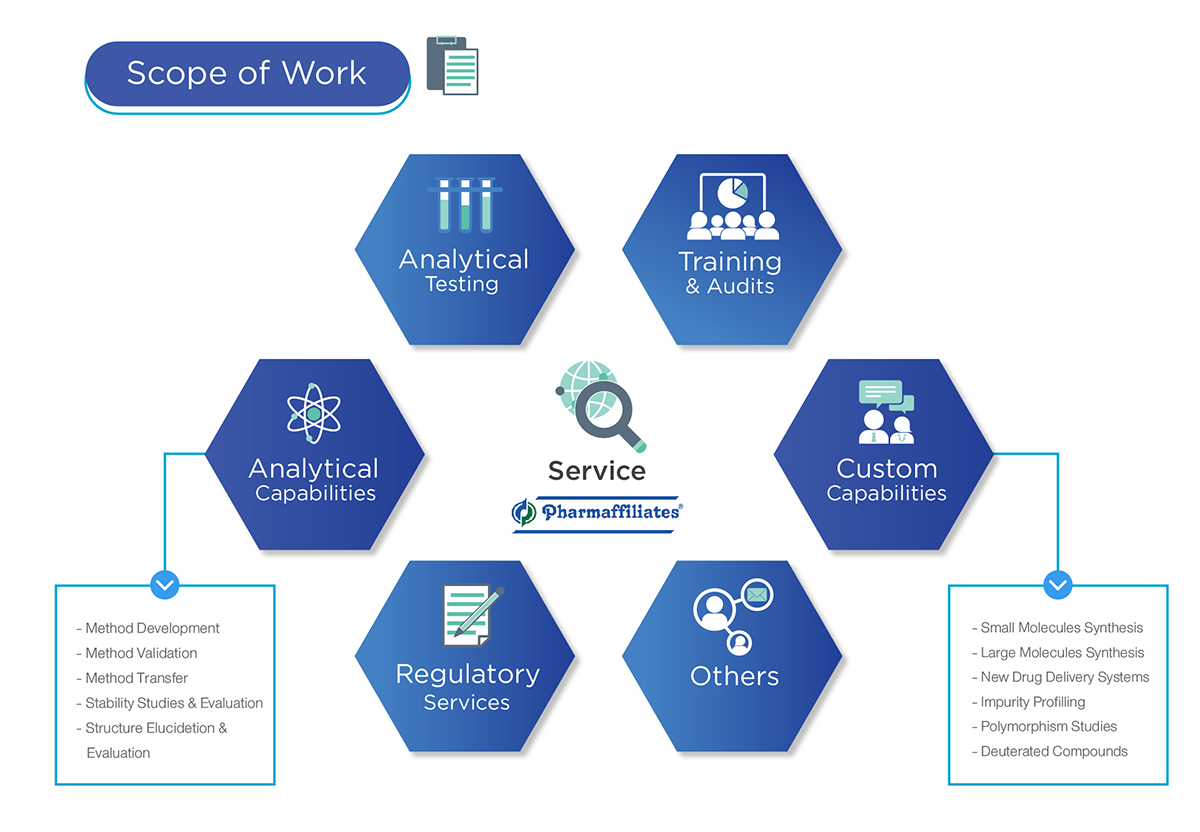 ด้วยทีมงานหลักของผู้เชี่ยวชาญด้านต่างๆของ Pharmaffiliates จากนักวิทยาศาสตร์ที่มีประสบการณ์สูง มีจุดแข็งหลักอยู่ที่การวิจัยสังเคราะห์ การวิจัยเชิงวิเคราะห์ NDDS และการให้คำปรึกษาด้านกฎระเบียบ โดยมีการทำงานในหลากหลายรูปแบบ อาทิ