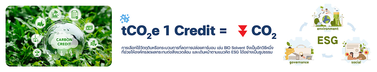 ด้วยเหตุนี้ BIO Solvent จึงถูกพัฒนาขึ้นเพื่อเป็นทางเลือกใหม่ โดยผลิตจากทรัพยากรหมุนเวียนและชีวมวล (Biomass) นอกจากจะให้ประสิทธิภาพการใช้งานที่เทียบเคียงกับสารเคมีแบบเดิมแล้ว ยังช่วยลดการปล่อยมลพิษ และเพิ่มโอกาสในการสะสมคาร์บอนเครดิต (tCO₂e) ให้กับภาคธุรกิจ